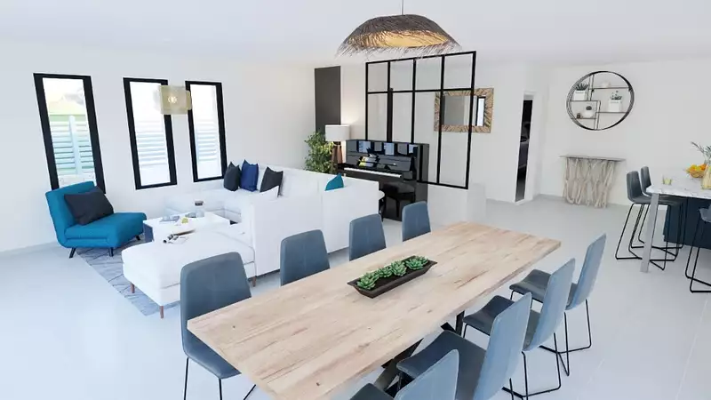 Maison individuelle de plain-pied au style contemporain, développant une surface habitable d'environ 100 m², avec garage intégré.