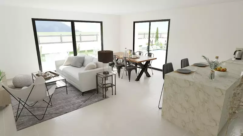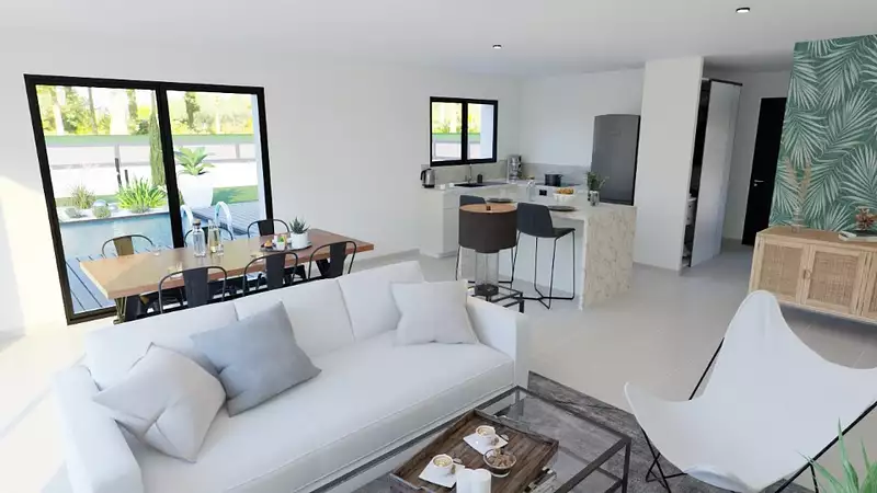 De style contemporain, cette villa séduit par son architecture simple et fonctionnelle. Elle s'articule autour d'une spacieuse pièce de vie largement ouverte au sud et à l'ouest, idéale pour profiter de la lumière naturelle.