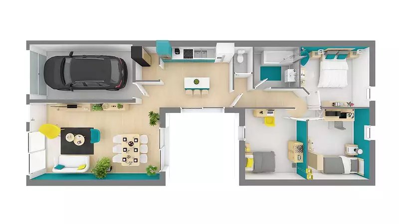 Univoque offre trois chambres spacieuses, promettant un confort inégalé pour toute la famille. La pièce de vie, cœur battant de la maison, est conçue pour être un espace de partage et de convivialité, baigné de lumière grâce aux baies coulissantes, une des options les plus plébiscitées par nos clients. Ces dernières permettent une transition fluide entre l'intérieur cosy et un extérieur invitant à la détente.