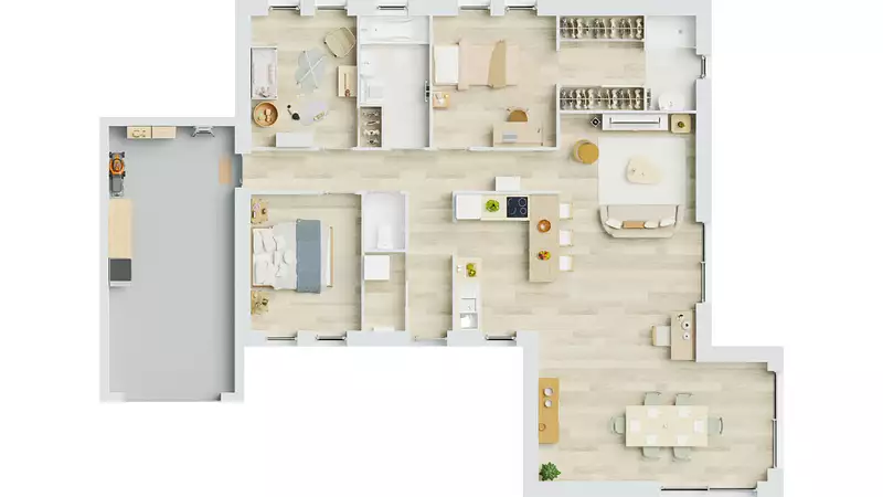 À l’intérieur de la VivaCity, l’élégance se marie à la fonctionnalité pour créer un cadre de vie exceptionnel. Avec ses trois chambres bien agencées, dont une suite parentale complète avec dressing et salle d’eau, cette maison offre un confort sans compromis. Un garage accolé à toit plat et une grande pièce de vie ouverte viennent compléter l’aménagement intérieur de ce superbe modèle. Découvrez une maison où chaque détail a été méticuleusement pensé pour vous offrir une expérience de vie harmonieuse.