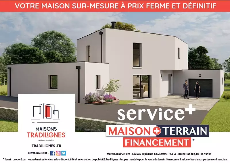 Terrain proposé par un partenaire foncier selon disponibilités et autorisation de publicité au prix de 180 000 €. Hors droit d'enregistrement et frais de notaire. Terrain + Maison proposés au prix de 248 000 € (Hors branchements et raccordements, papiers peints, peintures, revêtement de sol dans les chambres. Tarif modifiable sans préavis). Etiquette énergie : A. Différents modèles disponibles pour ce terrain. Assurances et garanties du constructeur (RC professionnelle, décennale, dommage ouvrage, garantie de remboursement de l'acompte, livraison à prix et délai convenu) : https://www.tradilignes.fr/mentions-legales/.