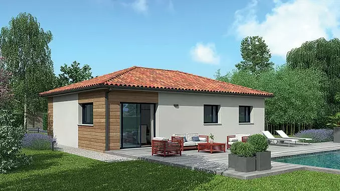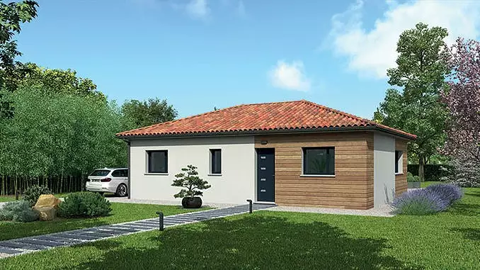 La maison de plain-pied Natiban est un modèle au plan simple et fonctionnel. Cette maison vous offre 3 belles chambres, ainsi qu'une pièce de vie entièrement ouverte composée d'un coin salon et d'un espace cuisine-repas, le tout baigné de lumière grâce à 3 ouvertures. Disponible dans tous les types de toitures régionales, cette maison ossature bois, allie classique et modernité grâce au choix d'une façade mixte enduit et bardage. Ce modèle est un bon compromis pour avoir une maison fonctionnelle à un prix accessible.