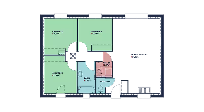 La maison dispose également d'une salle de bain avec des WC séparés, offrant un espace de vie fonctionnel et bien organisé pour toute la famille. Les options les plus demandées par les clients, telles que la domotique et l'enduit bi-ton, peuvent être intégrées pour personnaliser votre maison selon vos préférences.
