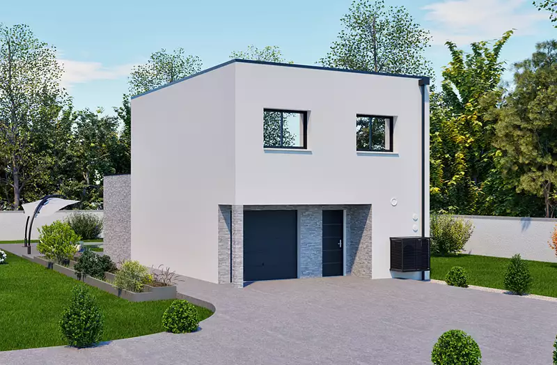 Le modèle Azurite est une maison contemporaine à étage d'une superficie de 104 m². Elle comporte 3 chambres spacieuses et dispose d'un vaste séjour/cuisine de 39 m² avec de grandes baies vitrées. L'espace nuit se situe à l'étage tout comme la salle d'eau équipée d'une douche et d'une double vasque et du deuxième WC indépendants. Cette maison a aussi l'avantage de disposer d'un garage intégré de 13,9 m². Ce dernier est équipé d'une borne de recharge pour véhicule électrique. A NOTER : Les plans intérieurs proposés sont ajustables selon vos souhaits (1).