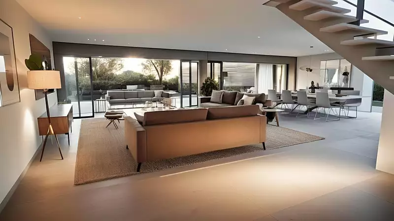 Grande pièce de vie de 85 m² : Lumineuse et ouverte, donnant sur un accès direct à la piscine.