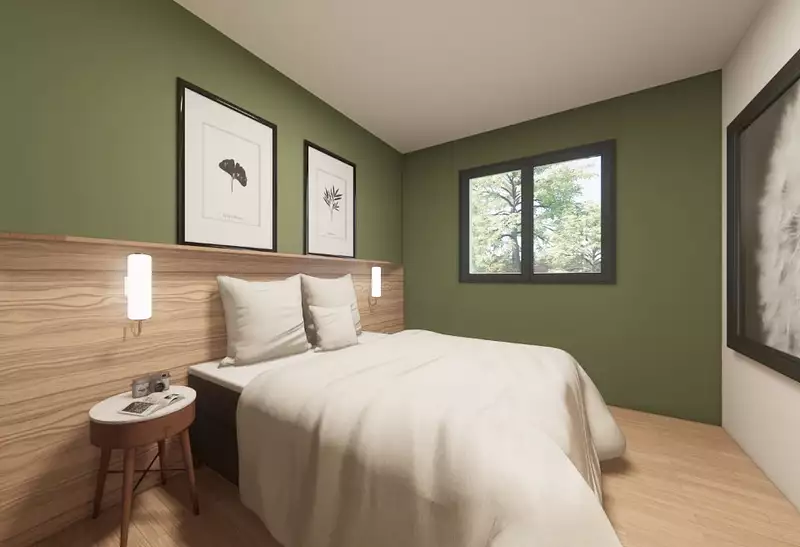 Conçue de plain-pied, elle propose une chambre, une cuisine ouverte sur une pièce de vie et une salle de bains.