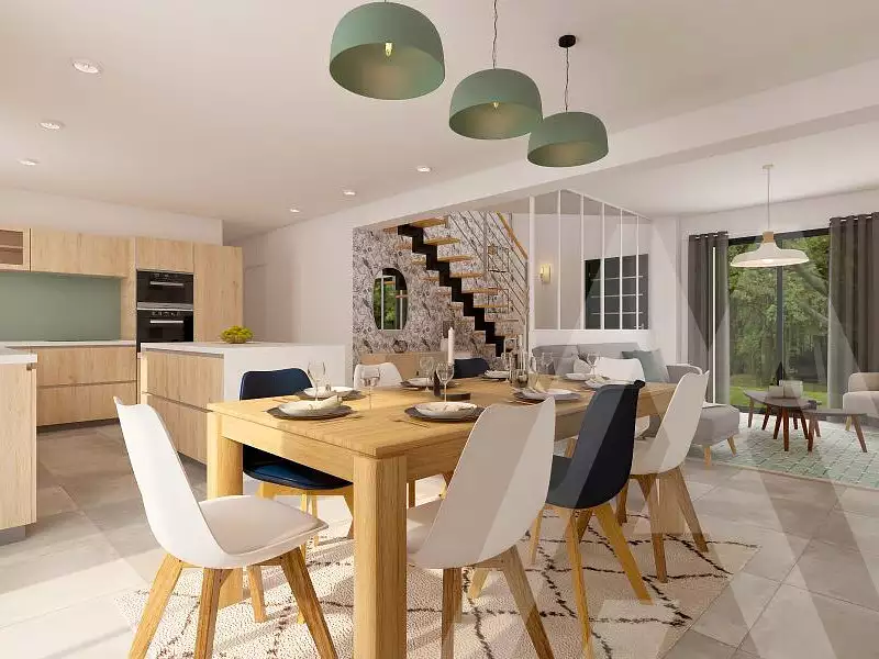 Au rez-de-chaussée, un espace de vie lumineux et un hall d'entrée. Un salon - séjour et une cuisine ouverte avec son cellier attenant.