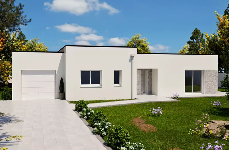 Le modèle Turquoise est une maison de plain-pied disposant d'une entrée pourvue d'un porche. Son architecture contemporaine offre des volumes affirmés pour une surface totale de 111 m². 55 m² sont dédiés au séjour cuisine baigné de lumière grâce à ses 2 baies vitrées opposées. Elle propose une grande entrée, 2 chambres spacieuses séparées par une salle de bains avec douche et double vasque, un WC et un cellier de 4,8 m² hébergeant entre-autre la batterie de stockage de l'énergie solaire. Il est possible en option d'ajouter un garage accolé de plus de 26 m². A NOTER : Les plans intérieurs proposés sont ajustables selon vos souhaits (1).