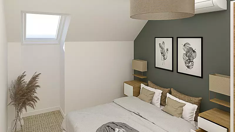 Cette maison à combles aménagés d'une surface habitable de 88 m² est construite sur vide sanitaire. Elle comprend 3 chambres, un séjour cuisine de plus de 38 m², une salle de bains, un WC indépendant et un garage intégré.