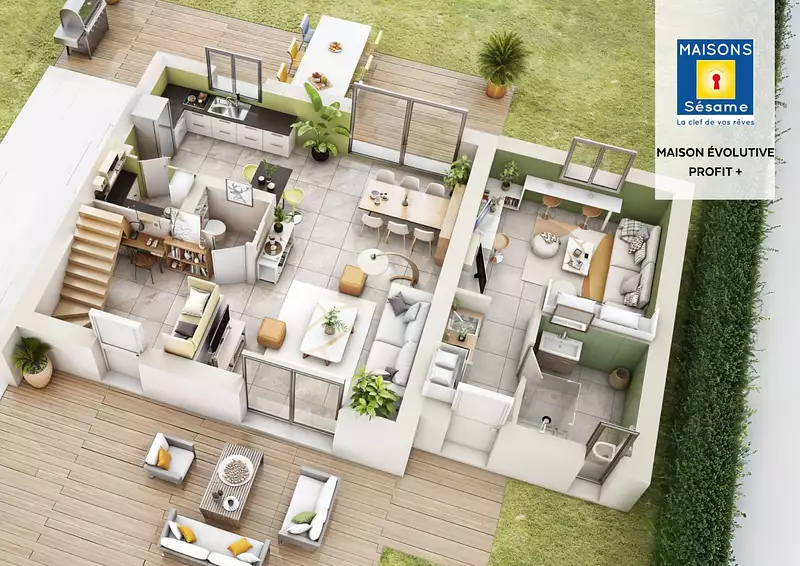 L'EVOLUTIVE PROFIT+ 110 combine modernité, flexibilité et fonctionnalité, avec un espace de vie principal pratique et un studio indépendant spacieux qui répond à de nombreux besoins. C'est une solution parfaite pour ceux qui recherchent une maison adaptable à long terme.