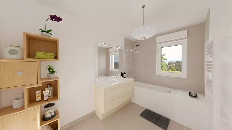 un carrelage 45*45 dans toutes les pièces, agréable au touché grâce au plancher chauffant made in France inclus.