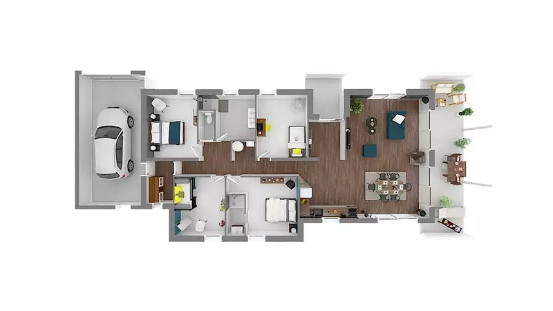 Ce modèle se distingue par son architecture audacieuse, avec un voile de béton qui lui confère une allure à la fois moderne et intemporelle, ainsi qu'un garage intégré pour plus de praticité. La structure linéaire de Linea, pensée pour optimiser chaque espace, s'accompagne d'une distribution des pièces favorisant une basse consommation énergétique. Cette maison est donc parfaitement conforme à la norme RE2020, garantissant une performance énergétique de premier plan pour un habitat respectueux de l'environnement.