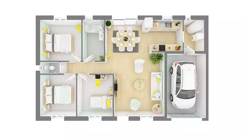 Le modèle Saphir se distingue par ses 4 pièces bien agencées, comprenant 3 chambres accueillantes pour toute la famille ou pour aménager un espace bureau selon vos besoins. La conception de cette maison a été pensée pour maximiser chaque mètre carré disponible, offrant ainsi un espace de vie chaleureux et fonctionnel.