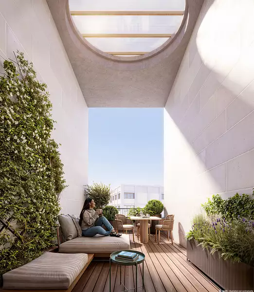 Avec son architecture affirmée et son approche éco-responsable, la résidence se distingue par l’utilisation de matériaux durables tels que la pierre massive porteuse, le bois ou encore le béton bas carbone.