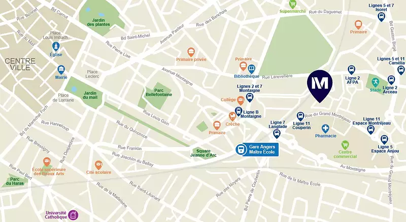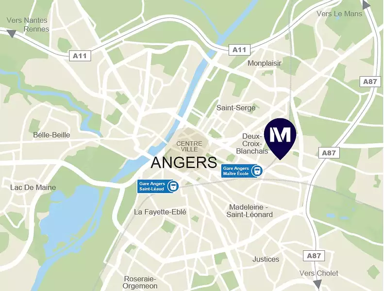 Parfaitement connectée, la résidence est desservie, au pied de l'immeuble, par l'arrêt de bus _ Montréjeau _ (ligne 11), permettant de rejoindre l'hypercentre d'Angers en seulement 10 min. Le tramway, à 10 min. à pied, la gare SNCF d'Angers Saint-Laud ainsi que l'échangeur autoroutier A87/A11 facilitent tous types de déplacements. Enfin, pour les déplacements doux, une piste cyclable longe la résidence longe la résidence.