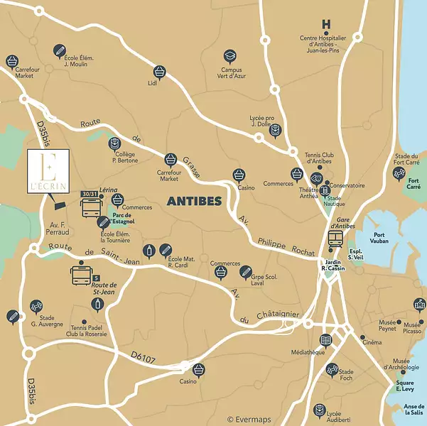À moins de 10 minutes(a) du Vieil Antibes et du Port Vauban, « L’Écrin » bénéficie d’un emplacement privilégié, proche des commerces, des écoles et des accès rapides vers Sophia-Antipolis ou l’autoroute. La plage est accessible en 7 minutes(a).