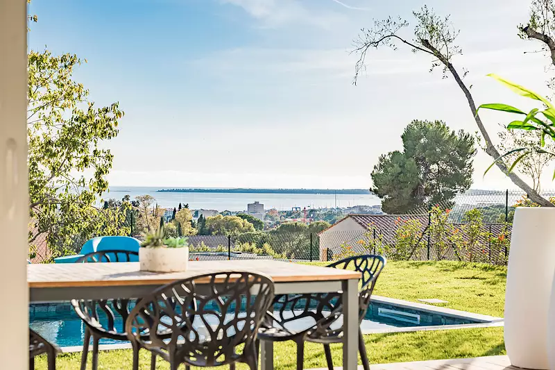 Villa d’exception 5 pièces de 144 m² habitables aux prestations raffinées et très lumineuse + 90 m² d’annexes, sur 662 m² de terrain plat : terrasse, jardin paysager, piscine traditionnelle. Très belles vues mer.