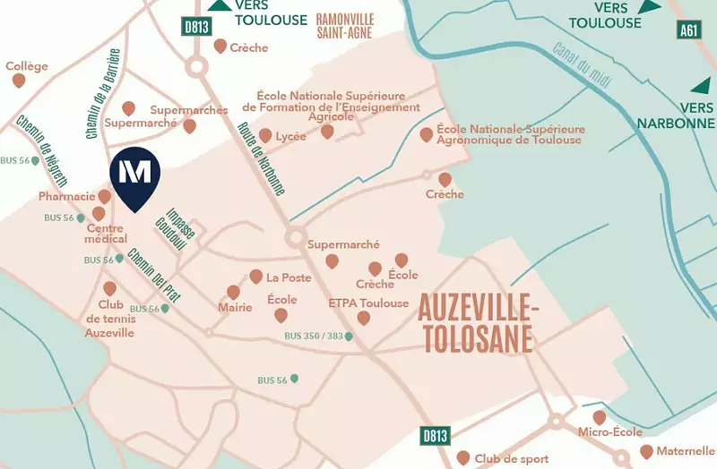 À seulement quelques kilomètres au sud de Toulouse, Auzeville-Tolosane séduit par son cadre verdoyant et son atmosphère paisible. Entre coteaux et Canal du Midi, cette commune huppée allie charme naturel et dynamisme urbain. Elle offre un cadre de vie préservé avec un cœur de ville convivial, des commerces de proximité, des établissements scolaires et des infrastructures de santé. Son accessibilité est optimale grâce aux grands axes routiers, comme l’A61 et la rocade, ainsi qu’à la ligne de bus 56 reliant l’Université Paul Sabatier et le métro ligne B. À proximité de pôles économiques majeurs tels qu’Enova-Labège et Airbus Defense & Space, elle attire aussi bien les familles que les actifs en quête de sérénité.