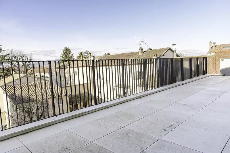 Terrasse de 26 m² orientée ouest, avec vue dégagée sur les Monts du Beaujolais