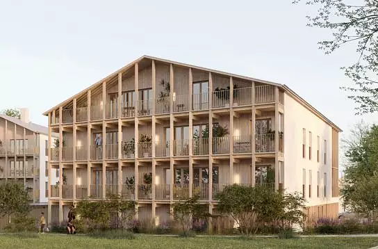 L’architecture contemporaine associe enduit clair, bardage bois et zinc, avec des balcons filants en bois naturel, des garde-corps métalliques et des pare-vues bois, pour une intégration harmonieuse dans l’environnement.