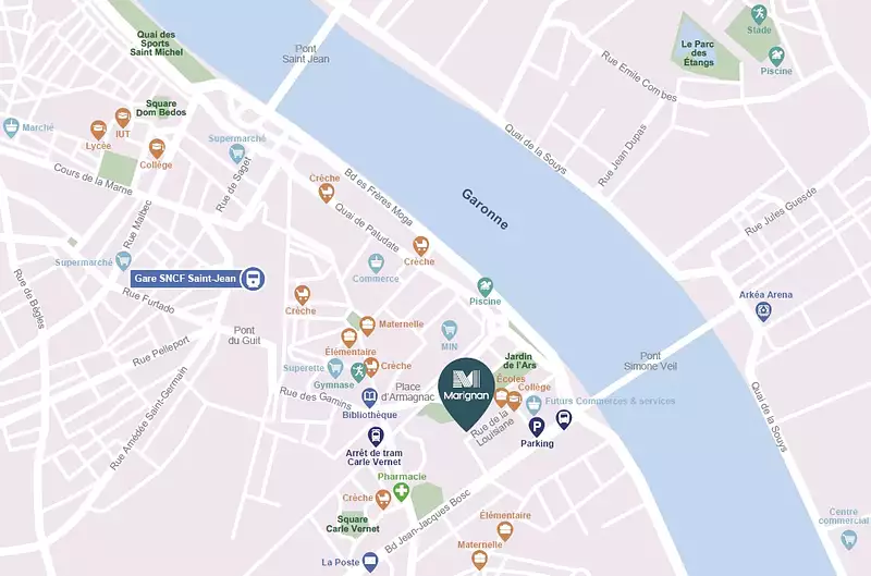 Dernier ouvrage qui parachève cette nouvelle centralité emblématique à Bordeaux, à proximité immédiate des quais réaménagés de la Garonne, du boulevard Jean-Jacques Bosc et du futur Pont Simone Veil, aux portes du centre-ville historique de Bordeaux et à 10 min. à pied de la gare Saint-Jean, découvrez notre nouvelle résidence aux usages mixtes, qui propose des appartements neufs déclinés du 2 au 4 pièces.