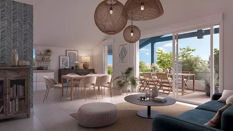 BAÏNA, à l’architecture élégante, empreinte d’influences landaises, propose une collection d’appartements du 2 au 5 pièces aux beaux volumes et aux prestations raffinées. Chaque logement dispose d’un espace extérieur, offrant ainsi une extension naturelle à votre habitat.