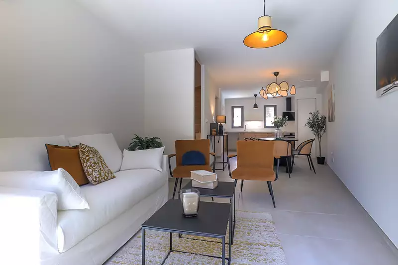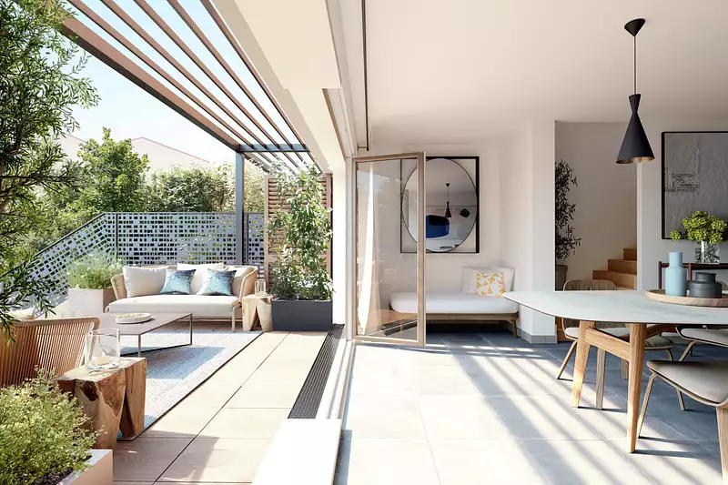Constituée de seulement sept maisons, la résidence offre des logements en triplex, ouverts sur l’extérieur par de grandes baies vitrées menant vers les terrasses et jardins.
