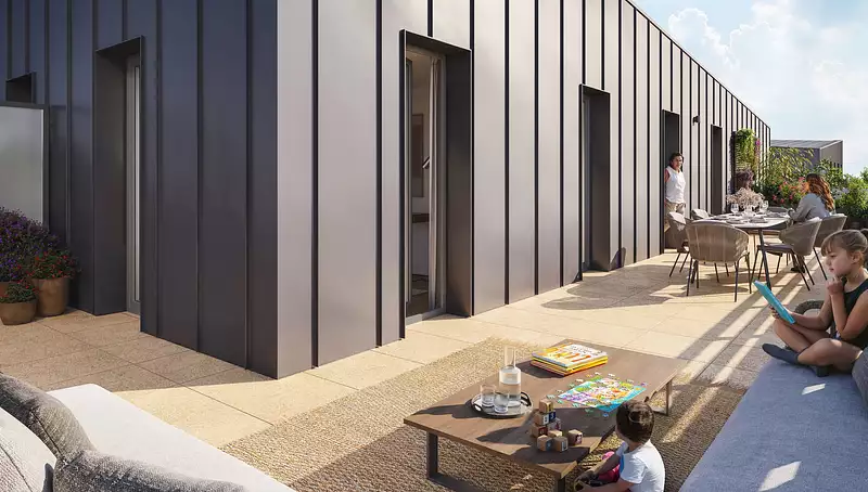 Appartements du studio au 4P avec espace extérieur : jardin, balcon, terrasse, et même de grandes terrasses plein ciel au dernier étage.