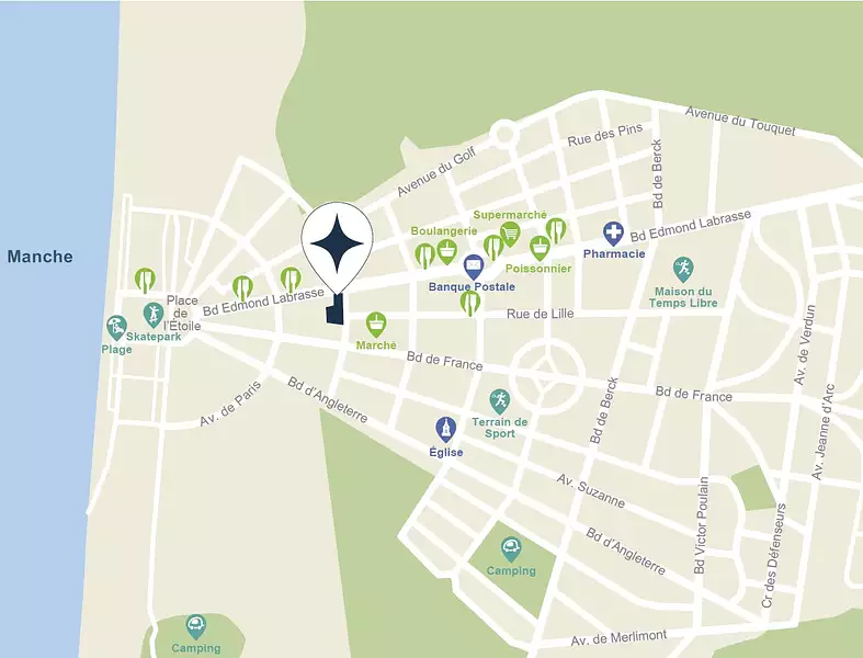 Côté déplacements, de nombreux arrêts de bus se trouvent à proximité de la résidence et offrent des liaisons régulières vers les villes voisines, notamment vers la station balnéaire du Touquet-Paris-Plage. En voiture, l’accès aux routes principales est rapide et pratique, permettant ainsi de rejoindre facilement les principaux axes routiers de la région.