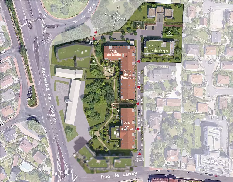 « Parc » se compose de cinq petits immeubles et de deux maisons, organisés autour d’une voie privée, entre le prieuré de Larrey et des maisons individuelles. Un cadre préservé, discret et verdoyant.