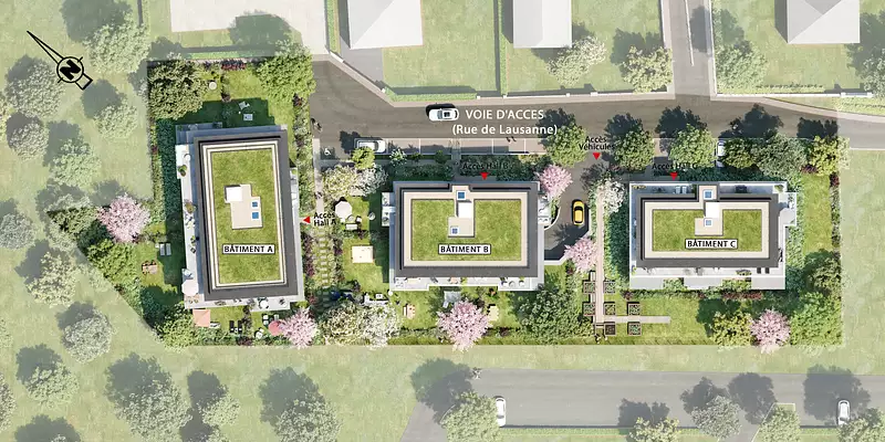 La résidence PRESTIGE se situe dans un quartier résidentiel calme et recherché. À 5 min à pied de la résidence, le lac de Divonne offre un cadre paisible avec vue sur le massif du Mont-Blanc. Écoles, collège, commerces et activités sont facilement accessibles.
