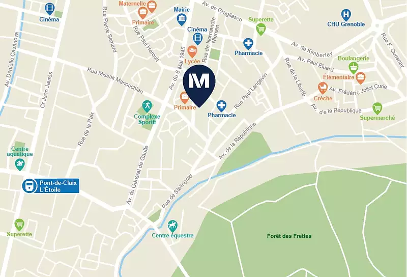 Située au sud de Grenoble, Échirolles séduit par son dynamisme et son environnement agréable. Ville en pleine évolution, elle bénéficie d’une situation stratégique, avec un accès rapide aux pôles économiques grenoblois, notamment le CHU, accessible en 5 min en voiture*, ainsi qu’à de nombreux espaces verts préservés. Son accessibilité est optimale grâce à la ligne A du tramway et aux lignes de bus situées à proximité de la résidence, permettant de rejoindre facilement le centre de Grenoble et ses facultés. La gare d’Échirolles, à seulement 9 min en transports en commun*, offre des liaisons rapides vers la gare TGV de Grenoble.