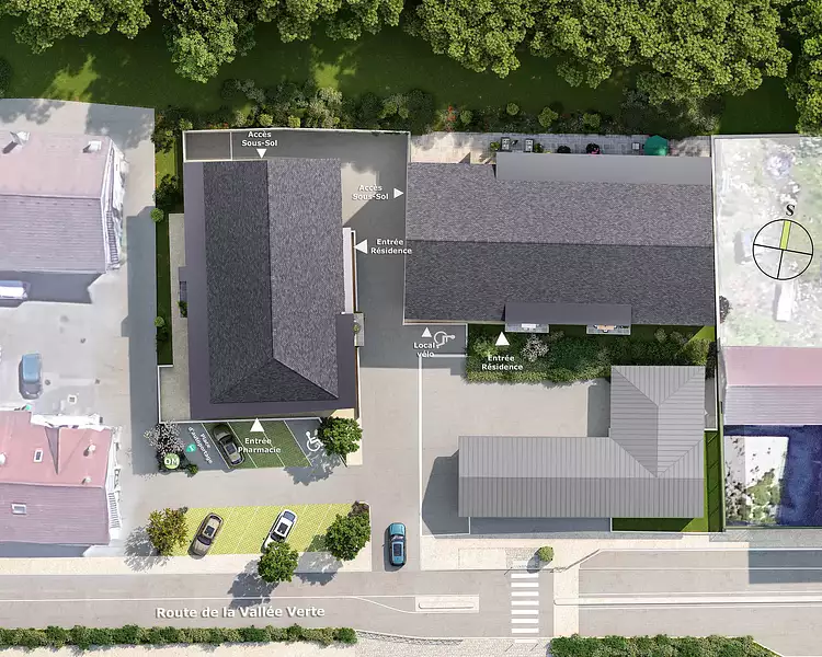 En rez-de-chaussée, une pharmacie occupe un emplacement stratégique en bordure de la Route de la Vallée Verte. Visible et facilement accessible depuis le domaine public, elle s’inscrit dans un socle commercial intégré au bâtiment, renforçant l’animation de la rue en apportant un service aux habitants.