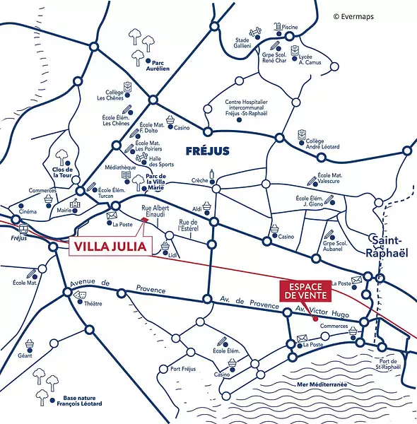 À proximité immédiate du centre-ville et à 1 800m(a) de la plage, la résidence bénéficie d’un emplacement calme et central. Commerces accessibles en moins de 8 minutes(b) à pied, écoles à proximité, bus à 2 minutes(b) et gare SNCF à 10 minutes(b) à pied.