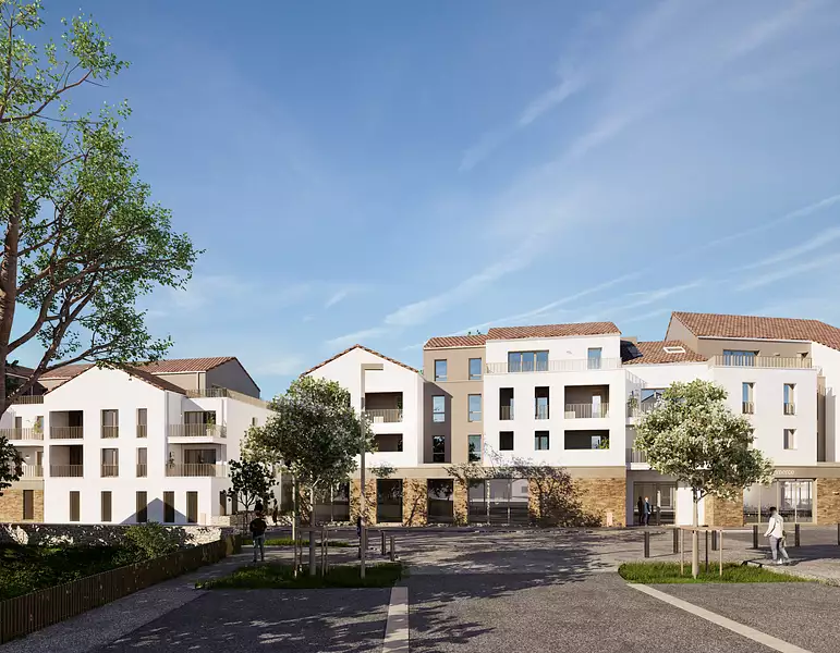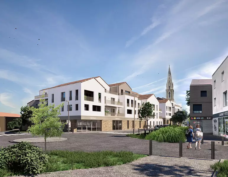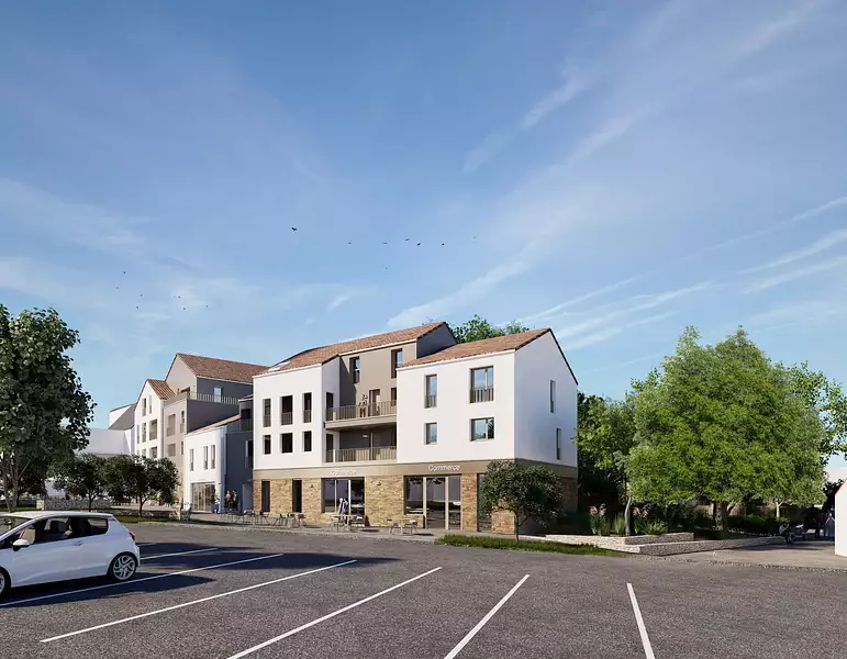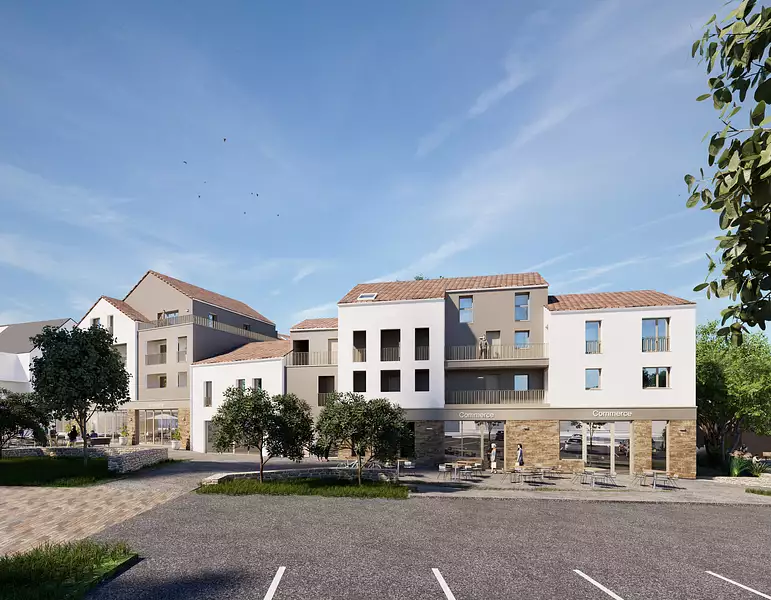 La résidence s'intègre harmonieusement dans ce paysage grâce à une architecture contemporaine et des matériaux choisis avec soin. En pied d'immeuble, des commerces viennent animer le quotidien, offrant aux futurs résidents un confort supplémentaire avec des services accessibles directement au bas de chez eux.