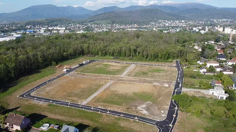 ISSENHEIM (68 500), au calme, dans une opération en lisière de forêt, avec une futur aménagement paysager central de plus de 33 ares qui accueillera un parc avec double cheminement piétons, un espace arboré et ombragé à vocation d'îlot de fraîcheur, un verger, des jardins partagés avec des bacs de plantations, du mobilier de repos, une aire de jeux pour les enfants … terrains pour maisons individuelles de 345 m² à 984 m², constructibilité immédiate. Sous-sol possible, garage en sous-sol possible, toit à pente entre 35° et 45° ou toit plat possible. Terrains vendus viabilisés, libres de constructeurs et d'architectes. Vente directe par l'aménageur, pas de commission d'agence.
