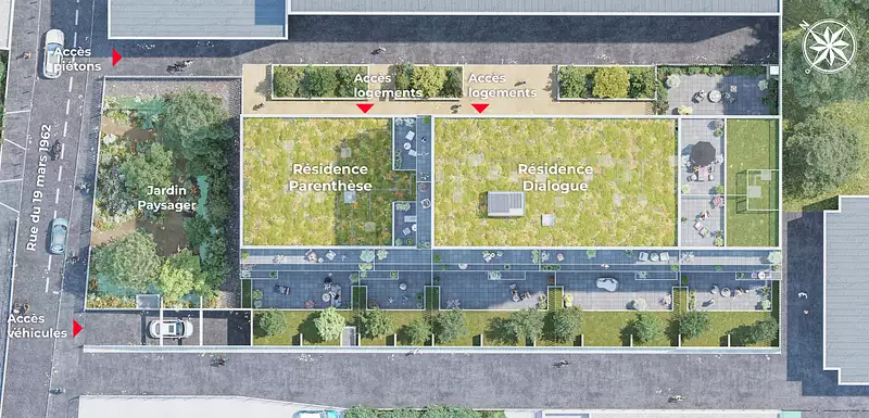 La résidence Dialogue est située rue du 19 Mars 1962 à Ivry-sur-Seine, à proximité du RER C (station Ivry-sur-Seine), du métro ligne 7 (station Pierre et Marie Curie), du tram T3a et de plusieurs lignes de bus. Les commerces, écoles et services sont accessibles en moins de 10 minutes* à pied, pour un quotidien pratique et autonome. Les travaux sont actuellement en cours. Espaces partagés et services inclus : locaux vélos avec bornes de réparation, bibliothèque partagée, jardin arboré privé au coeur de la résidence. Avantages financiers : bénéficiez de la TVA réduite et de l'éligibilité au Prêt à Taux Zéro (PTZ) pour faciliter votre accession à la propriété.