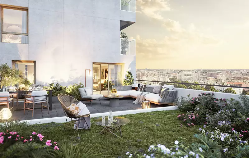 Dialogue offre également des espaces partagés et services inclus, favorisant le bien-vivre : locaux vélos équipés de bornes de réparation, bibliothèque partagée et jardin arboré privé au cœur de la résidence.