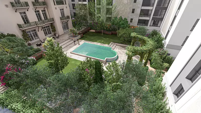 Au coeur du projet, un superbe espace paysager s’inspire des jardins de la Belle Époque : pergolas fleuries, allées romantiques, bassin miroir et jardin des agrumes.