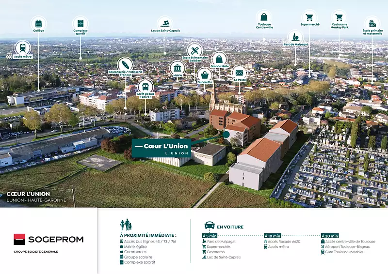 La résidence Coeur L'Union est située en plein coeur de ville à L'Union, à 7 km** de Toulouse. Les commerces, écoles et transports en commun sont à proximité immédiate, et la rocade Est se rejoint en 5 minutes**.