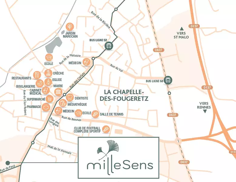 Pour la vie quotidienne, les commerces sont à proximité en centre-bourg, crèches, écoles maternelles et primaires également. A 2 mn en voiture, la voie rapide Rennes - Saint-Malo permet de se rendre d'un côté aux parcs d'affaires de Saint-Grégoire et de l'autre côté au centre commercial "Cap Malo" et à son grand parc de loisirs.