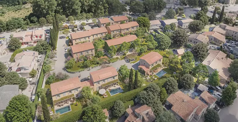 Côté architecture, l'ensemble propose des façades au tons naturels, des toitures en tuiles canal, des volets persiennes et des doubles génoises, typique des maisons provençales.