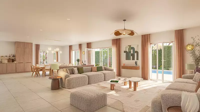 Découvrez des prestations soignées de grand standing : pompe à chaleur, climatisation, carrelage grand format, volets roulants motorisés, domotique, et pour certaines villas, piscine privée avec couverture immergée motorisée. Le domaine est sécurisé, avec contrôle d'accès par vidéophone et portes blindées. Conçu en VEFA (Vente en l'Etat Futur Achèvement), ce projet vous permet de personnaliser votre logement selon vos envies.