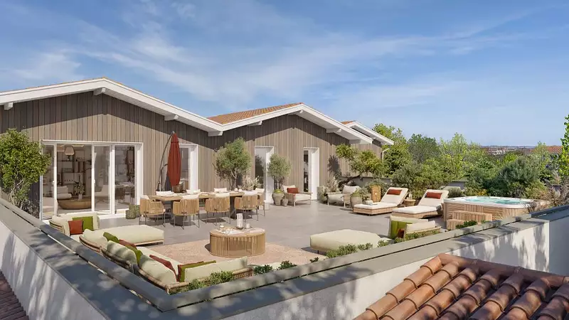 Son architecture élégante et singulière, inspirée des emblématiques cabanes tchanquées, confère à la résidence une identité forte et parfaitement intégrée à son environnement.