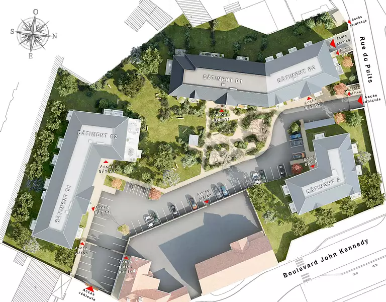 Le projet prévoit la réalisation de trois bâtiments de 2 à 3 étages, harmonieusement agencés autour d'un coeur d'îlot paysager arboré. Les appartements - du studio au 5 pièces - bénéficient tous d'un espace extérieur (balcon, terrasse ou jardin privatif). Proche du centre-ville et des transports, la résidence répondra aux dernières normes environnementales (RE2020/25).