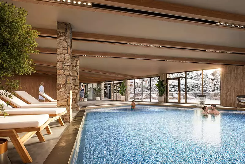 Casiers à ski chauffés, décoration soignée aux codes montagnards, mobilier authentique, piscine intérieure chauffée, saunas, hammam, jacuzzi, bains/sauts suédois et espace bien-être avec cabines de soins.
