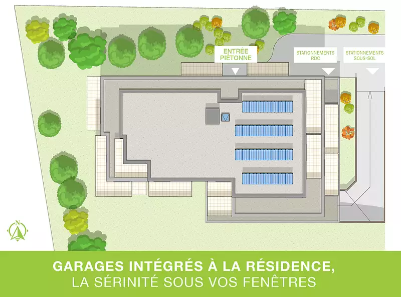 L’organisation de la résidence a été pensée pour offrir un cadre paisible, où les espaces extérieurs restent exclusivement dédiés aux résidents : aucun stationnement extérieur, aucun véhicule au pied du bâtiment.