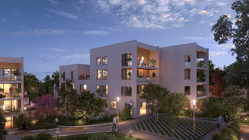 En contrebas, au cœur d’un parc de 2 hectares enrichi de 130 arbres, quatre ilots contemporains se fondent dans l’environnement naturel où patio, terrasse et balcon font entrer le paysage dans les logements.