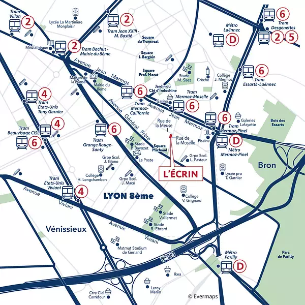 • À 2 minutes* à pied du Tram T6 et du bus C15, station Mermoz Moselle
