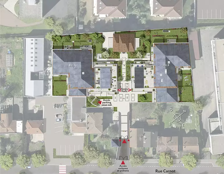 En retrait de la rue Carnot, la réalisation se dévoile au bout d’un passage privé. Ses deux petits immeubles à l’architecture classique s’intègrent discrètement dans un cadre résidentiel.